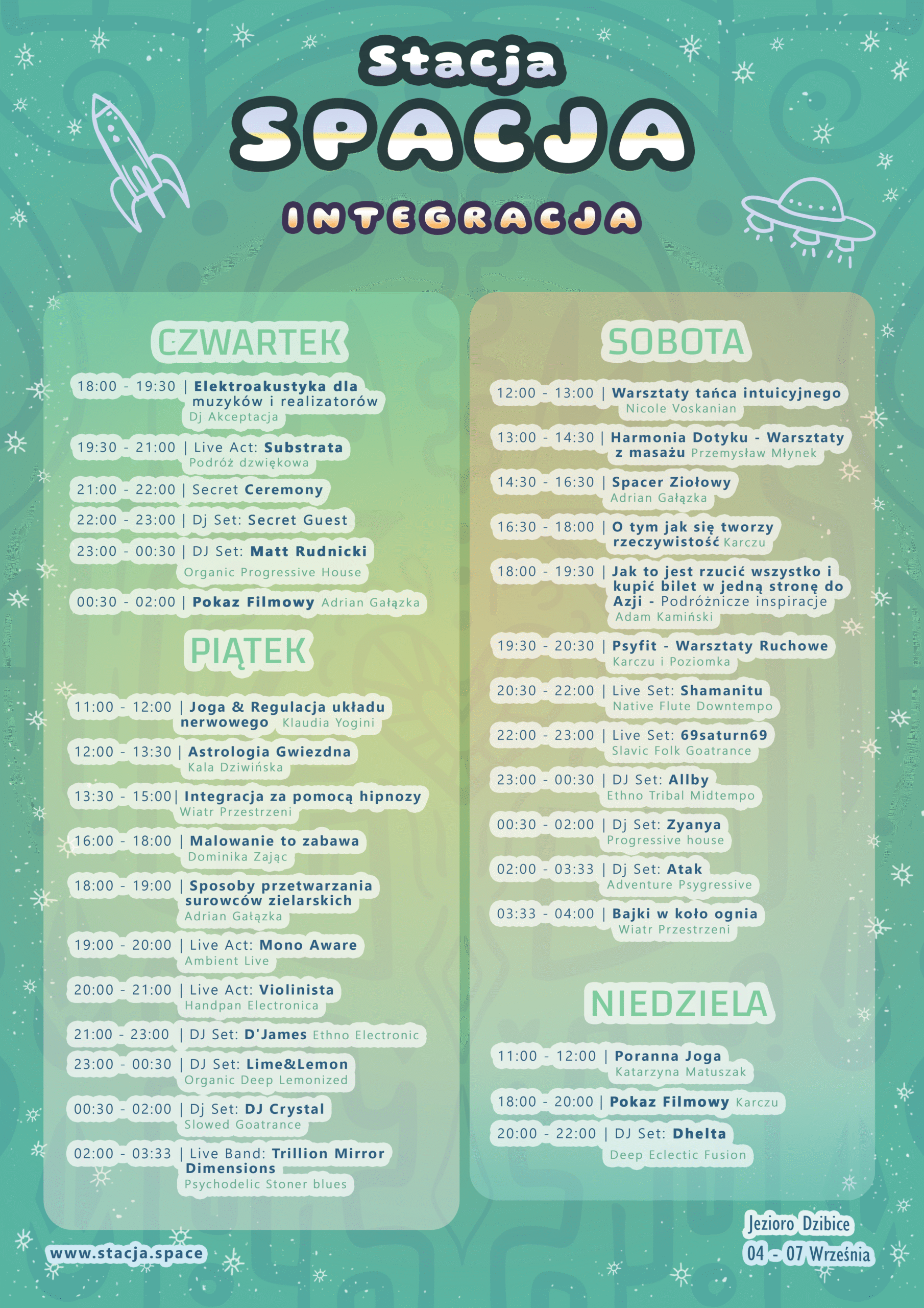Stacja Spacja to inicjatywa, której celem jest danie wam przestrzeni rozwojowej. Łączymy w sobie ludzi, muzykę, warsztaty, prelekcje i wszelkie inspiracje. W naszej przestrzeni każdy może dać od siebie to, co ma najlepsze. Idea jest prosta – w pędzie życia zatrzymujemy się na chwilę i dzielimy tym, co nas pasjonuje i co chcielibyśmy pokazać innym. Czy masz talent muzyczny, czy chcesz przekazać wiedzę, czy masz jakieś zdolności, które wprowadzą w świat nowych umiejętności? A może chcesz przyjść na nasze wydarzenie i się pouśmiechać? Nie musisz robić nic. Wystarczy że jesteś!